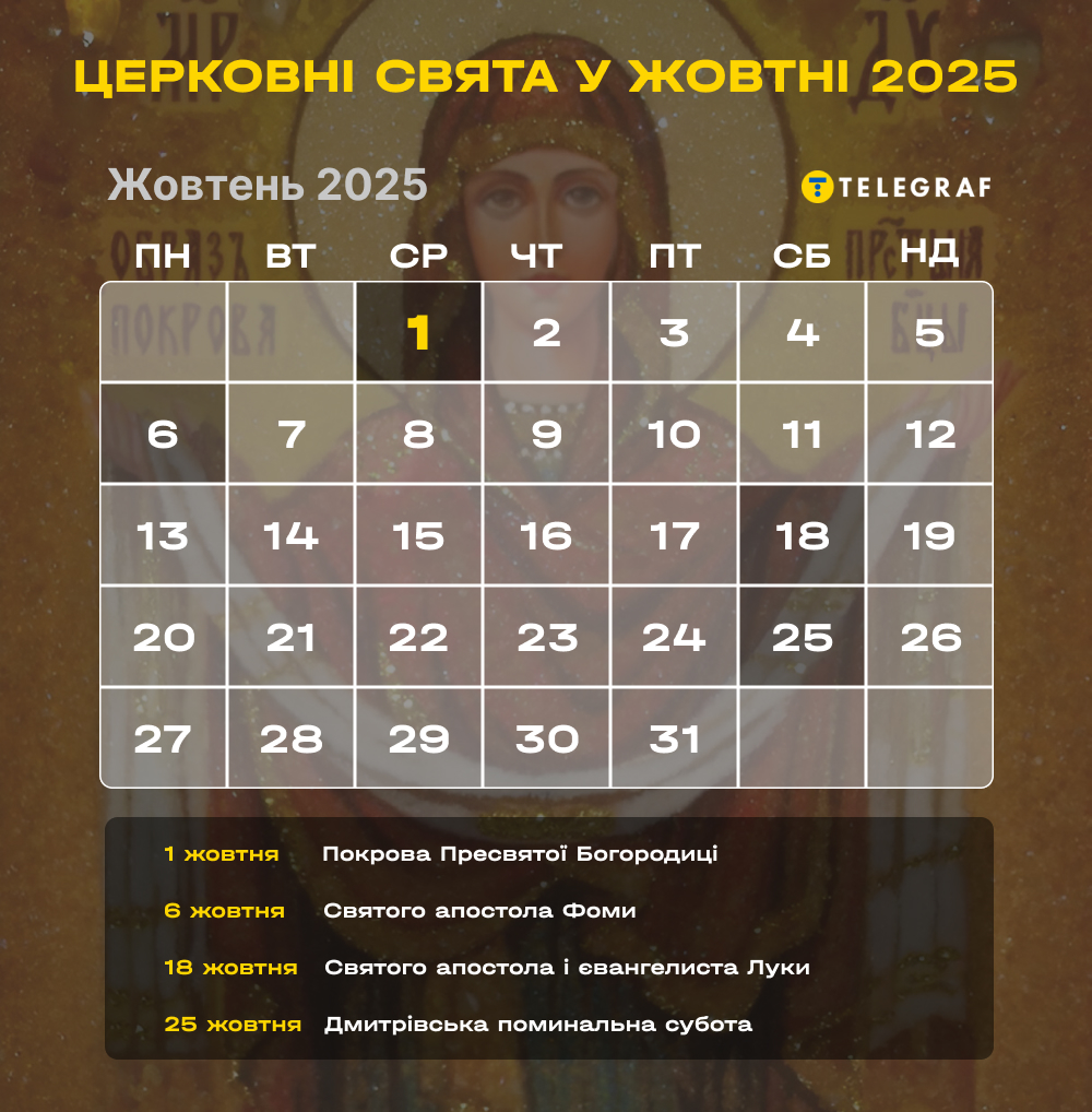 - 1 жовтня — Покрова Пресвятої Богородиці;
