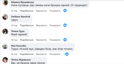 У коментарях підказали, що це — турун облямований (Сarabus marginalis), багато хто написав, що ніколи такого не бачив. Жук виглядає дуже ефектно — його блискуче чорне тіло обведене яскравою неоновою облямівкою, що переливається жовтим, зеленим, синім кольорами. Через це жучка також називають "неонка". Одна з коментаторок захоплено зазначила, що турун гарний, наче гудзик, чи брошка.