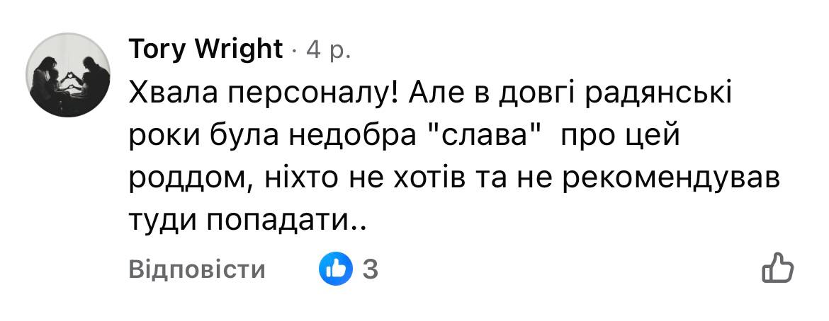 - "Хвала персоналу! Але в довгі радянські роки про цей пологовий будинок ходила недобра "слава" — ніхто не хотів і не радив туди потрапляти".