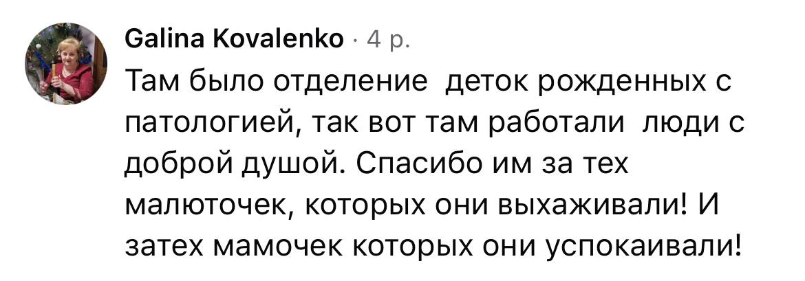 - "Там було відділення для діток, народжених із патологією, і працювали там люди з добрим серцем. Дякую їм за тих малюків, яких вони виходжували! І за тих матусь, яких вони заспокоювали!".