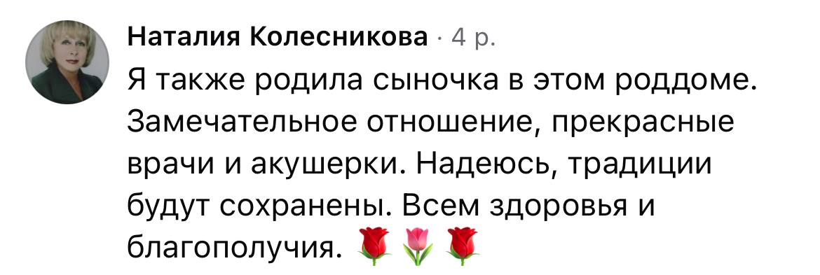- "Я також народила синочка в цьому пологовому будинку. Чудове ставлення, прекрасні лікарі та акушерки. Сподіваюся, традиції буде збережено. Усім здоров’я та добробуту".