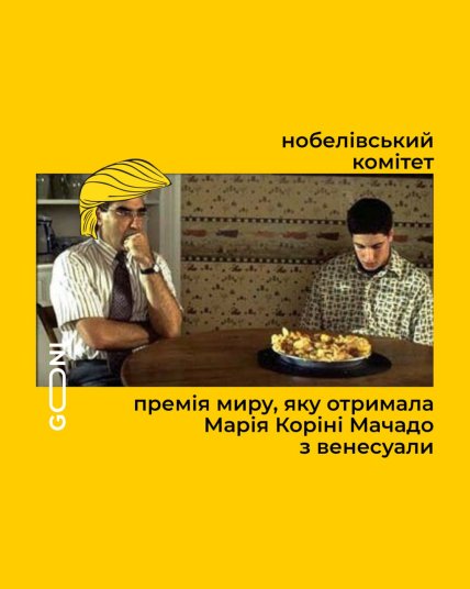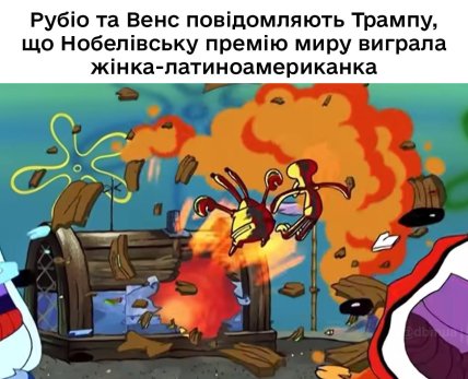 "Телеграф" зібрав найкращі меми про Трампа і Нобелівську премію. Зауважимо, що нагороду, про яку так мріяв голова Білого дому, отримала венесуельська опозиційна політична діячка, лідерка демократичних сил Марія Коріна Мачадо.
