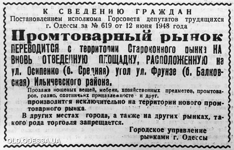 Зауважимо, що у 1989 році ринок перевели за місто, на "7-й кілометр", де до цього були кукурудзяні поля. Проте це не знищило попит людей, а навіть навпаки, чимало містян приїздили сюди купувати і продукти, і речі. Саме тоді й почали Старокінний ринок називати "толчок", адже попит на нього був чималий. В радянські часи тут можна було купити все: від ексклюзивних джинсів, привезених моряками з-за кордону, до товарів широкого вжитку, яких катастрофічно не вистачало в магазинах.