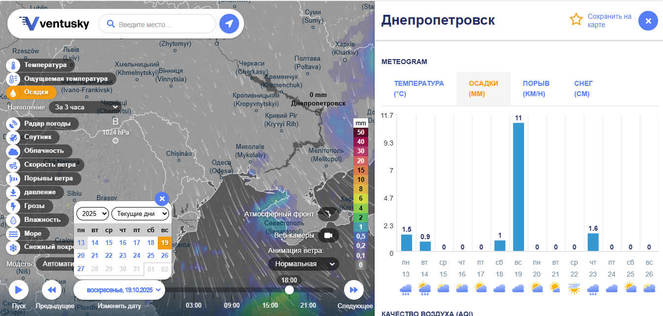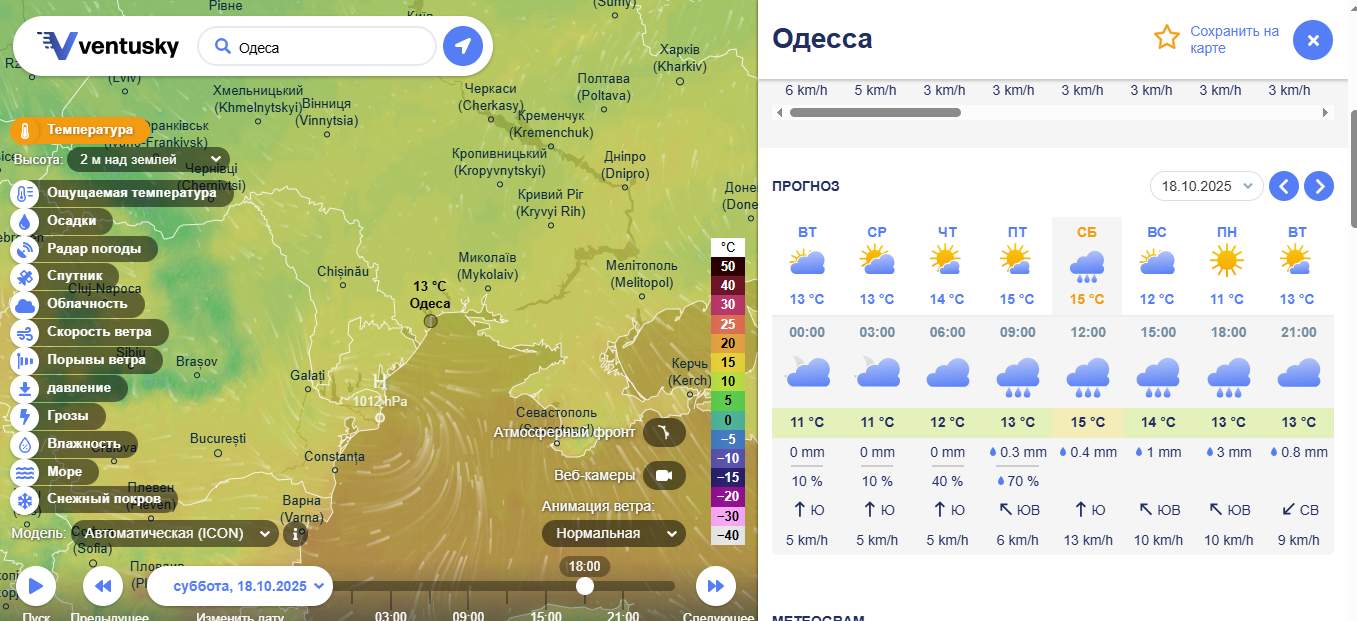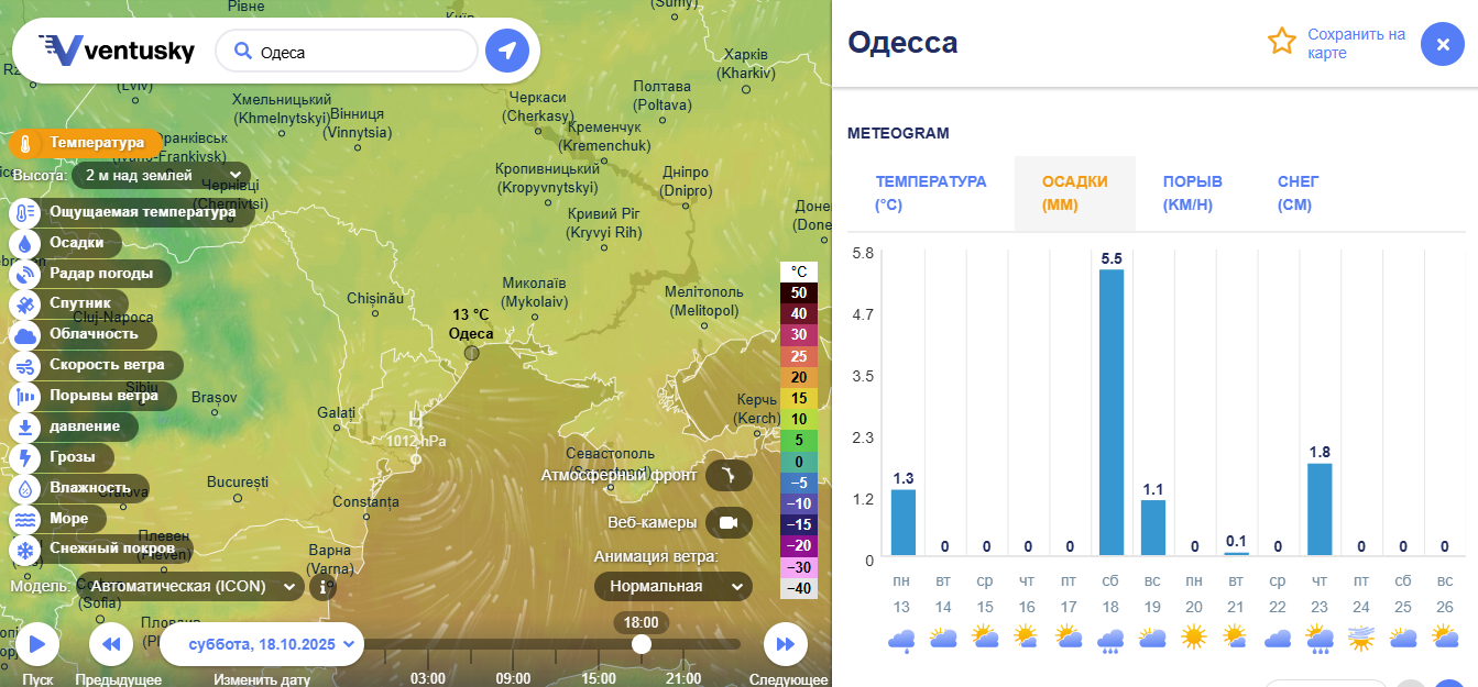 Зокрема, 18 жовтня, в Одесі прогнозують дощ із самого ранку — опади розпочнуться близько 9:00 і продовжаться майже до вечора, стихнувши ближче до 18:00. За даними Ventusky, за добу може випасти до 5,5 мм дощу. Така кількість вважається помірною, але при сильних поривах вітру та поганій роботі зливових стоків окремі вулиці міста знову можуть виявитися підтопленими.