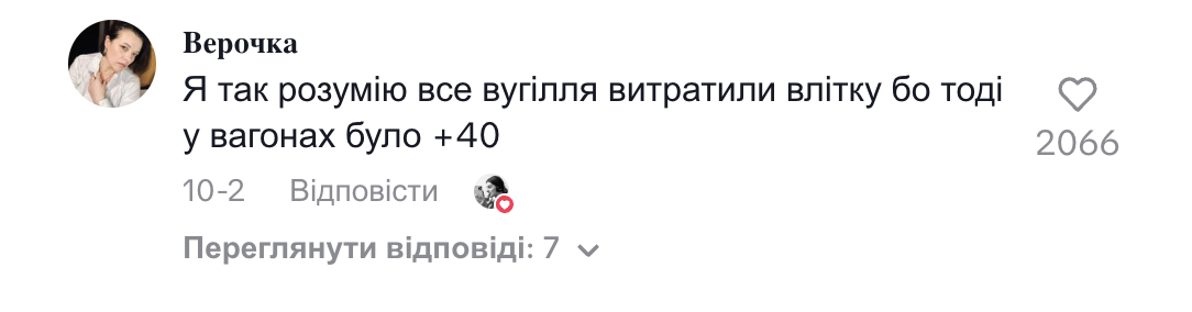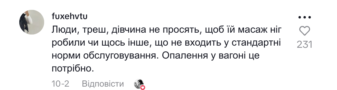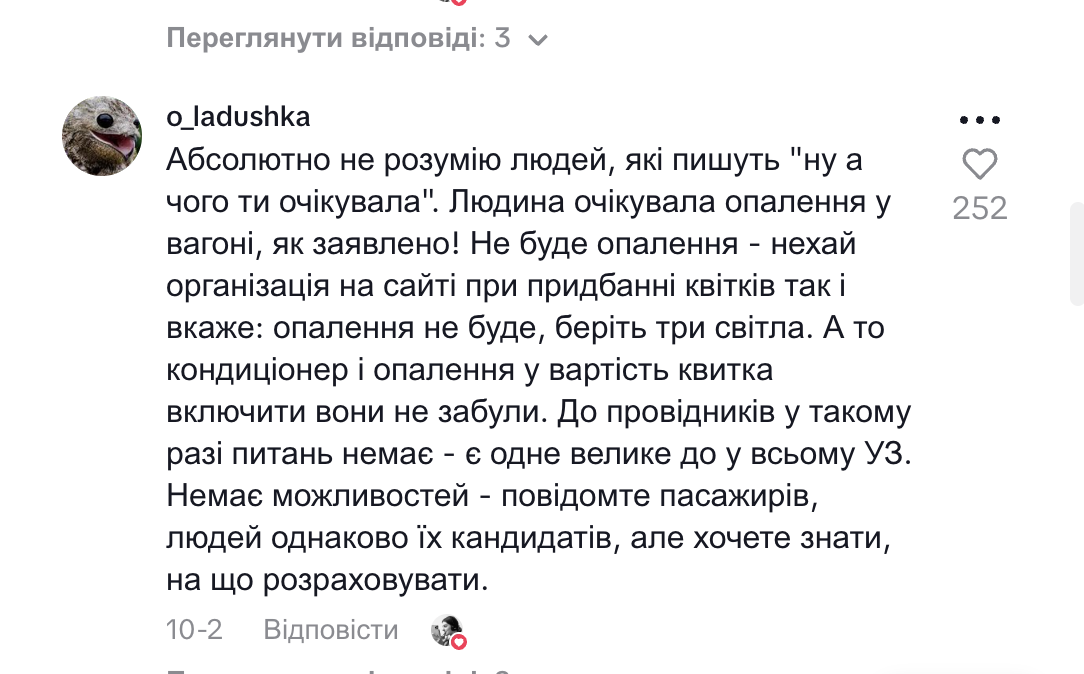 Однак у коментарях думка користувачів розділилась. Адже були ті, хто писали, що у деяких вагонах топлять так, що дихати нічим. Але були люди, які закликали дівчину не скаржитись та "подякувати УЗ, яка працює в складних умовах". Однак і тут чимало людей наголосило, що опалення в вагонах — це базова потреба, яку перевізник має закривати.