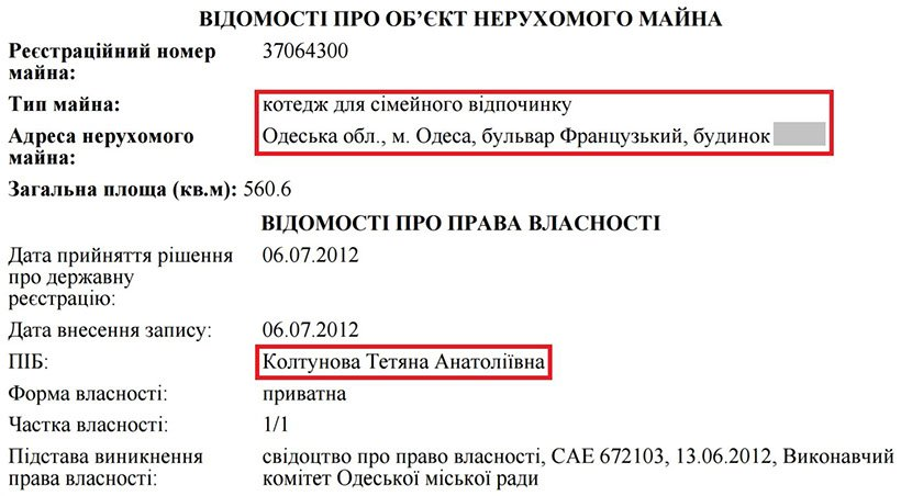 У розслідуванні йдеться, що Колтунова придбала елітну нерухомість в Одесі, включаючи квартиру площею 296 м² в житловому комплексі Ark Palace в районі Аркадії. Також вона володіла будинком на 560 м² у котеджному містечку "Королівські сади" та елінгом на узбережжі Чорного моря.