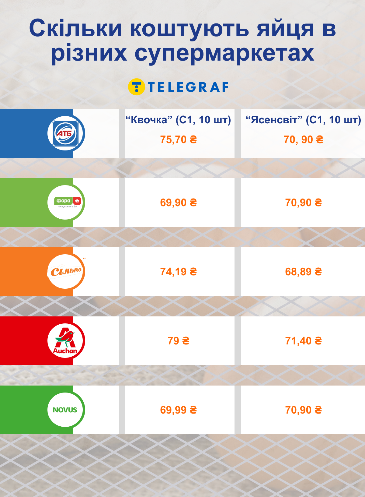 Найвища вартість яєць "Квочка" і "Ясенсвіт" — в Ашані (79,00 грн і 71,40 грн). Найдешевші яйця продають у Форі (69,90 грн) і в Сільпо (68,89 грн) відповідно.