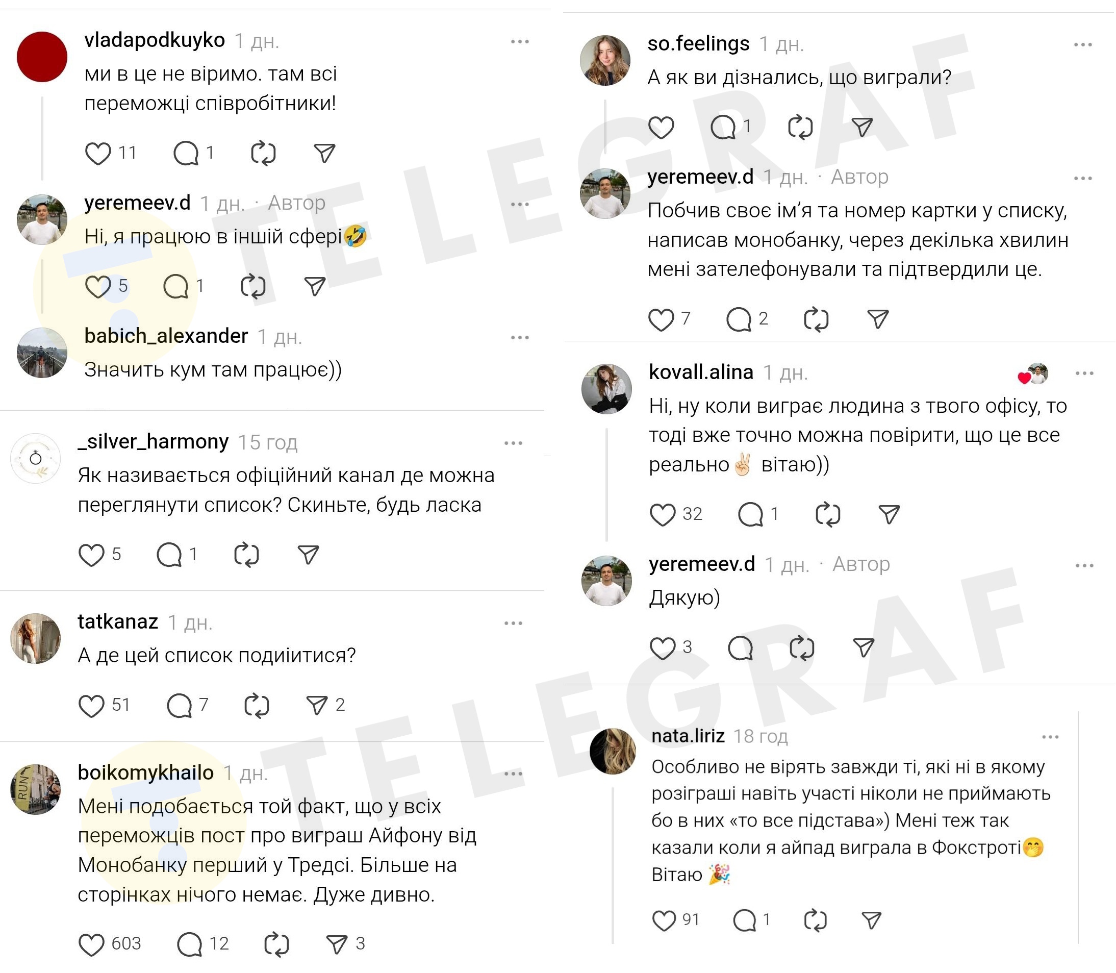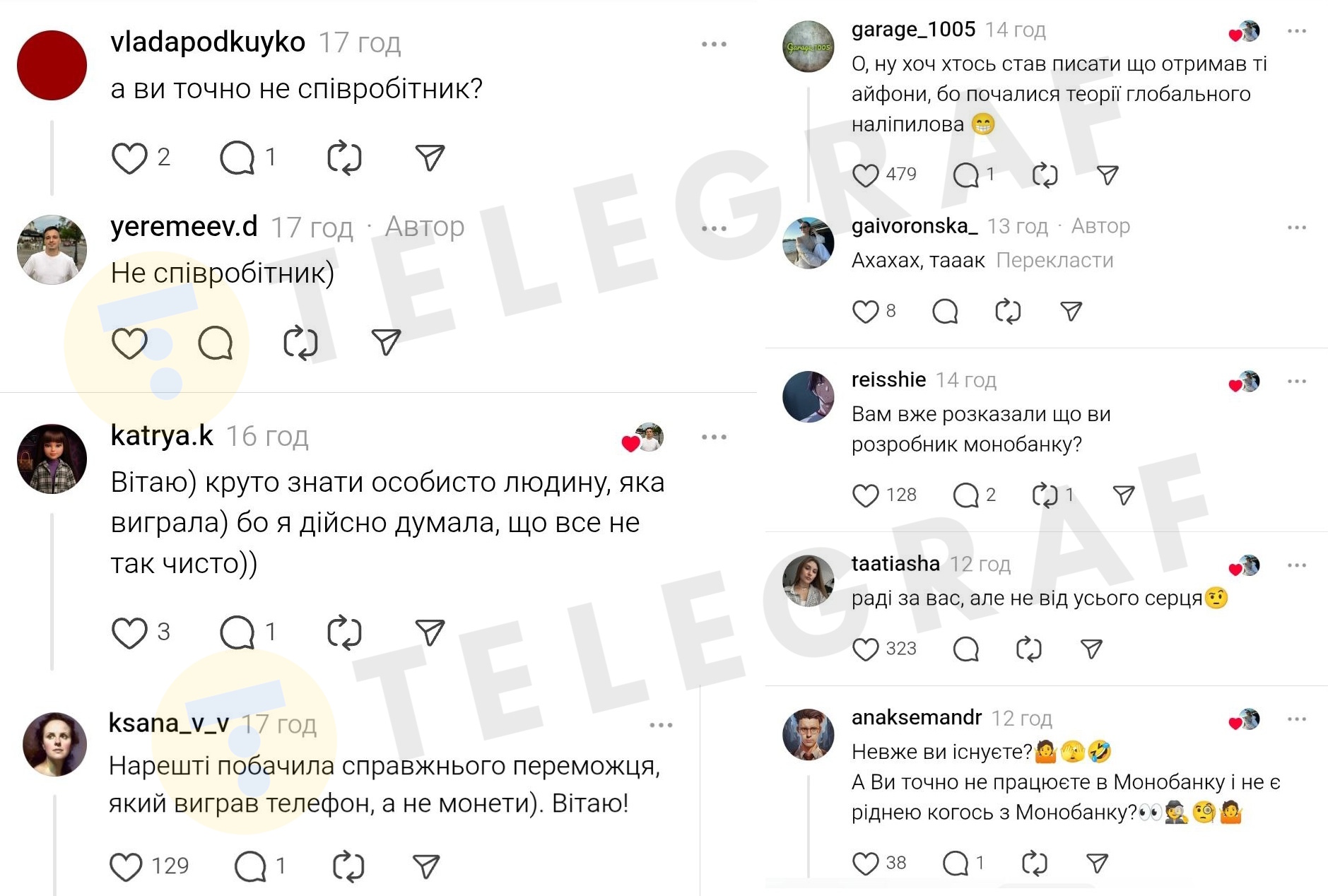 - Мені подобається той факт, що у всіх переможців пост про виграш Айфона від Монобанку перший у Тредсі. Більше на сторінках немає нічого. Дуже дивно.