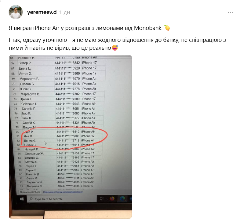 Один із користувачів соцмережі Threads Денис Єрємєєв опублікував скріншот і розповів, що виграв iPhone у розіграші з лимонами від Монобанку. Під його постом почалося обговорення, в якому деякі користувачі висловили сумніви, що все було чесно.