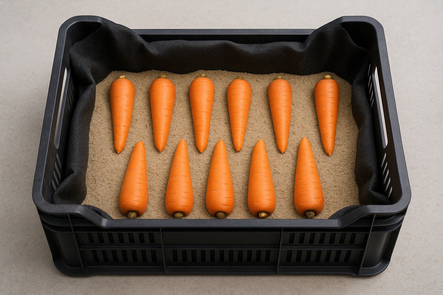 Найзручніше зберігати моркву у пластикових ящиках. На дно варто покласти агротканину. Потім насипаємо сухий пісок або тирсу — вони допоможуть зберегти стабільну температуру й не дадуть коренеплодам пересохнути.