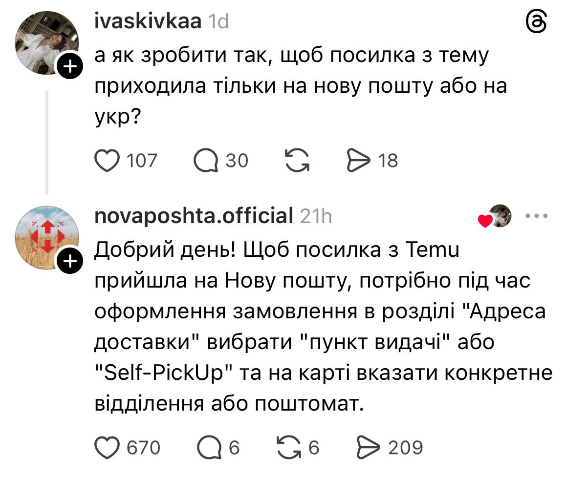 За словами "Нової пошти", якщо клієнт хоче замовити посилку з "Тему" через цю пошту, треба зробити кілька кроків. А саме — під час оформлення замовлення в розділі "Адреса доставки" вибрати "Пункт видачі" або "Self-PickUp". Далі на карті вказати конкретне відділення або поштомат. Підтвердити посилку та очікувати її доставки.