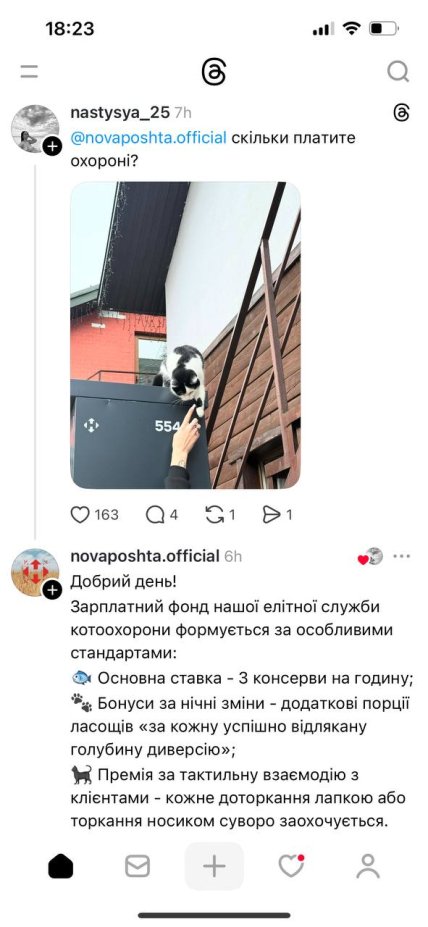 Авторка публікації жартома запитала у "Нової Пошти" про "зарплатню" пухнастого охоронця поштомата: "скільки платите охороні". Дівчині відповіли та з гумором розповіли про "особливі стандарти" зарплатного фонду елітної служби котоохорони "НП".