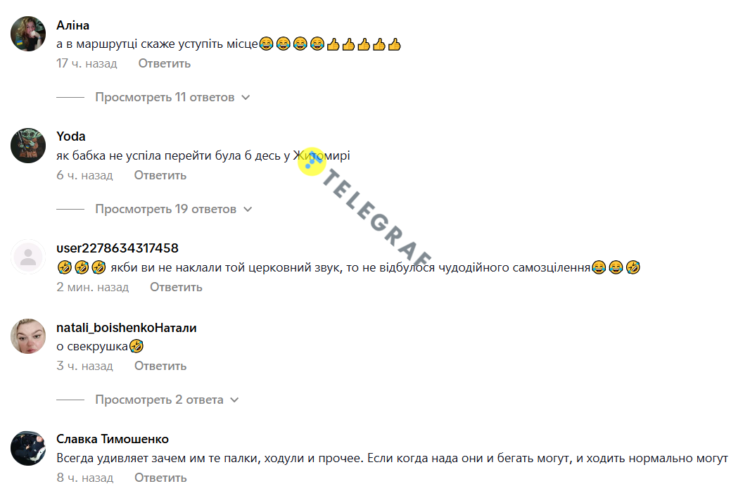 Іноді вони відкидають убік палицю, без якої ще хвилину тому не могли ходити, або просто несуть її в руці. Найпоширенішими випадками "зцілення" літніх жінок є: автобус або тролейбус, що відходить, а також акції в АТБ та інших супермаркетах.