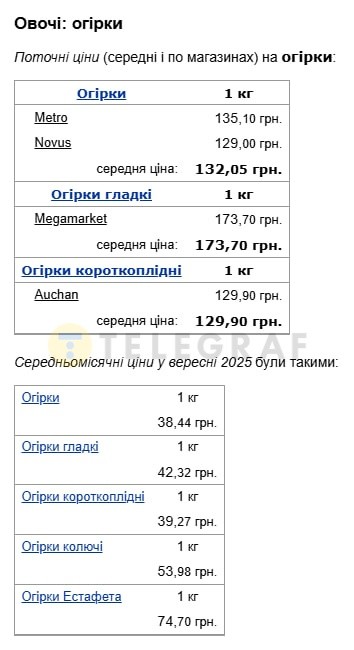 - огірки гладкі виросли у вартості до 173,70, коли місяцем раніше коштували 42,32 гривні;