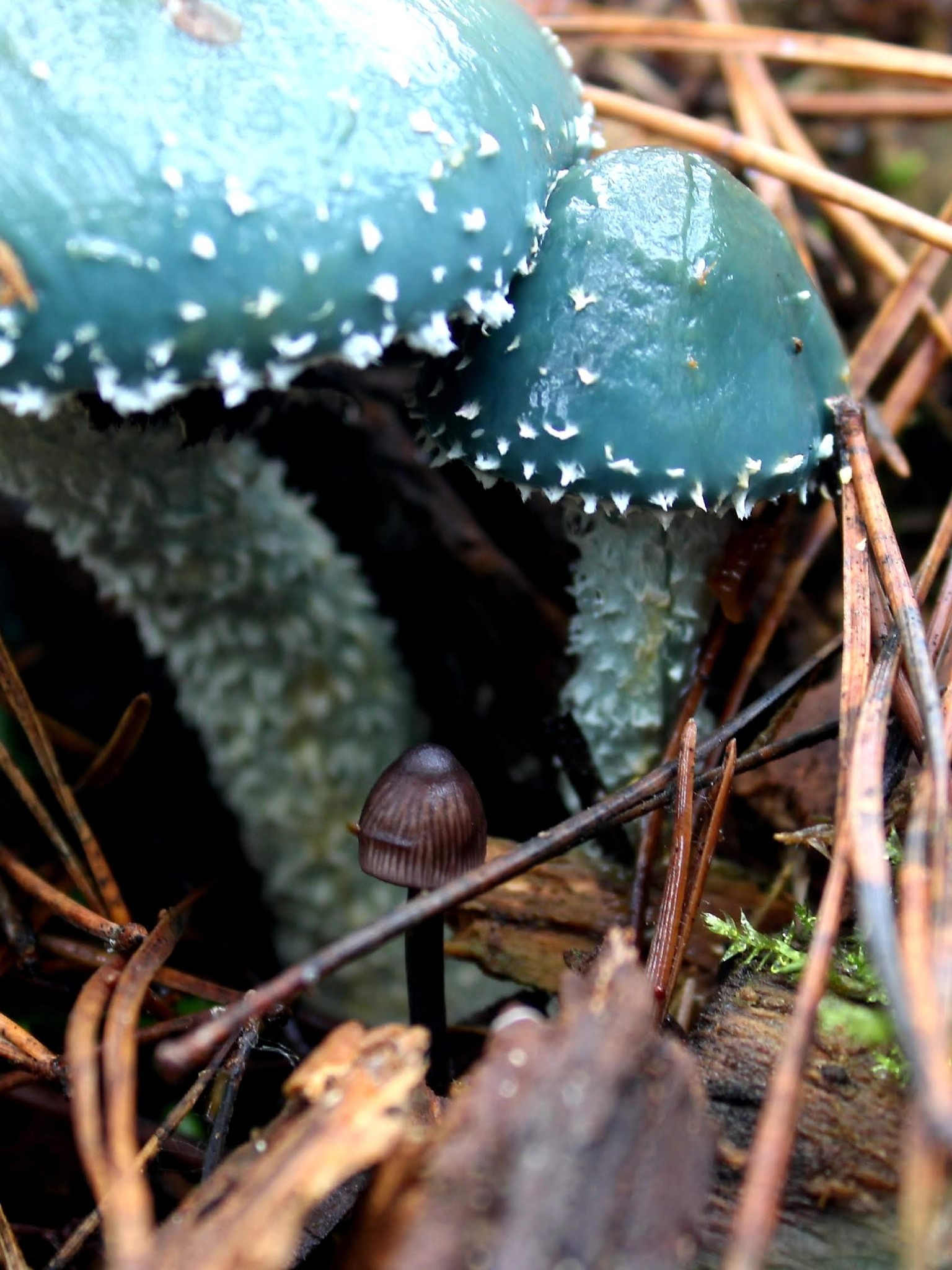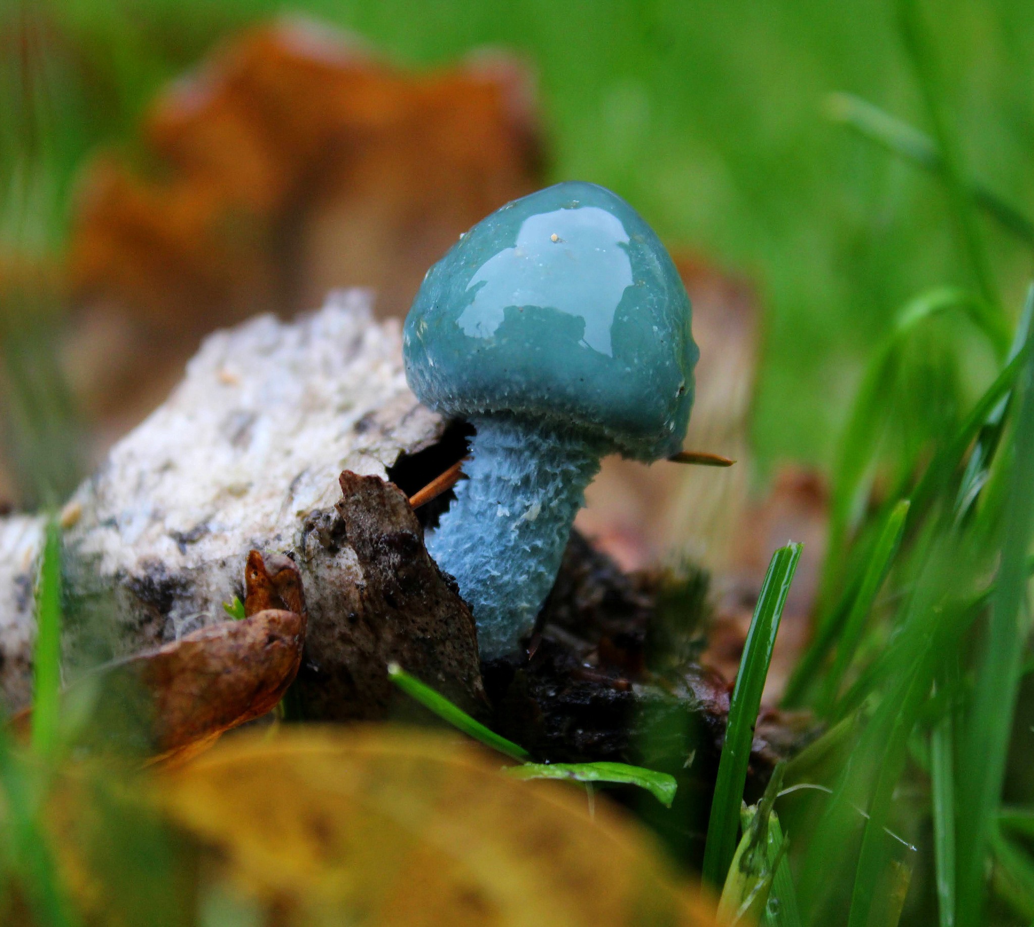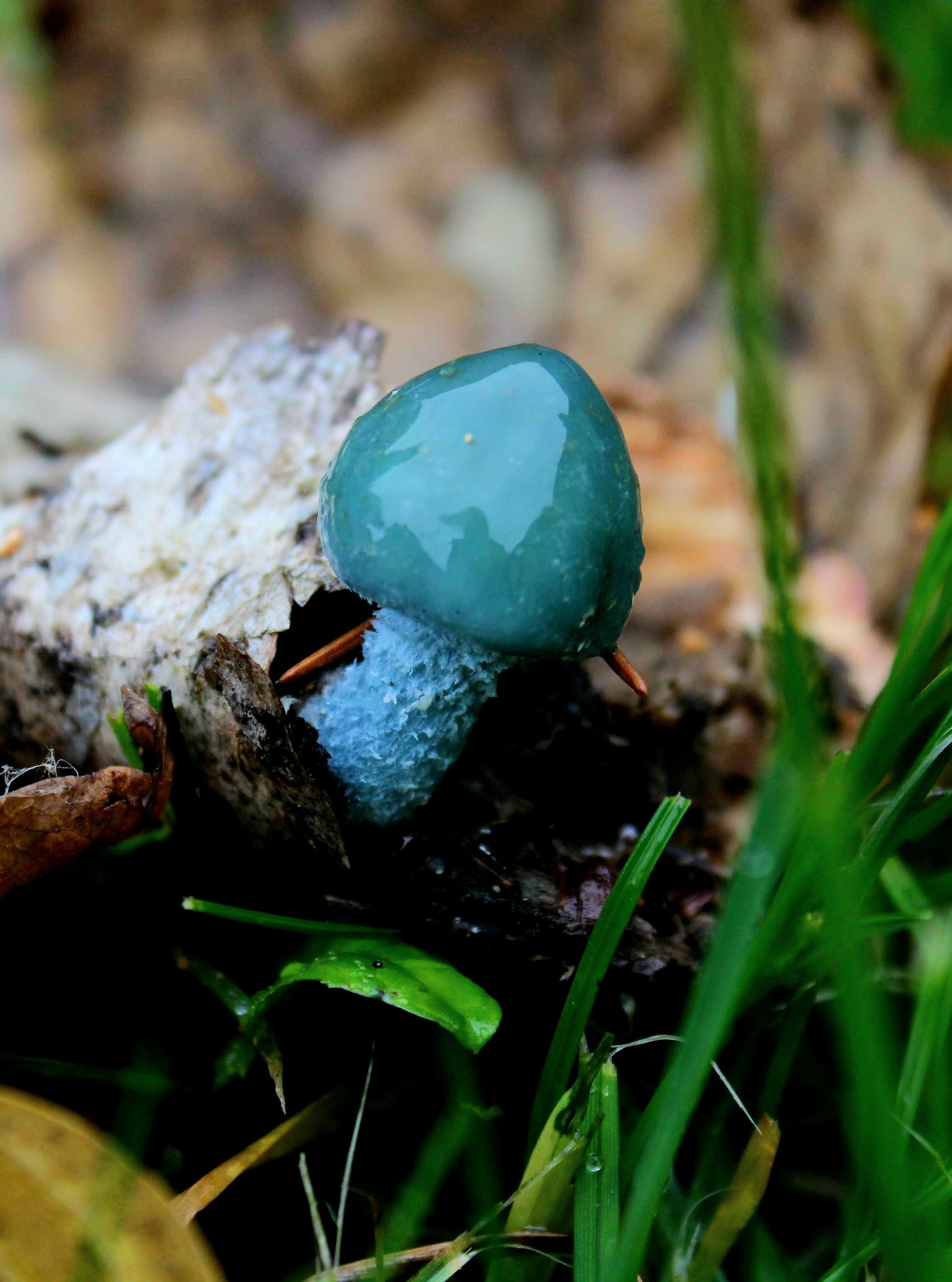 Як видно на фото, гриб має незвичайний колір яскравого бірюзового відтінку. Хоча протягом його життя колір шапочки може змінюватися – від синьо-зеленого до жовтувато-блакитного. Також може змінюватися і форма шапочки — спочатку вона у формі дзвіночка, а потім випрямляється і стає більш плоскою.