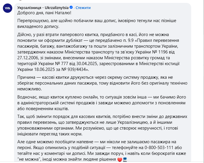 В "Укрзалізниці" відповіли та підтвердили, що у разі втрати паперового квитка, придбаного в касі, його дійсно не можна поновити чи оформити дублікат. Це передбачено п. 9.9 "Правил перевезення пасажирів, багажу, вантажобагажу та пошти залізничним транспортом України.