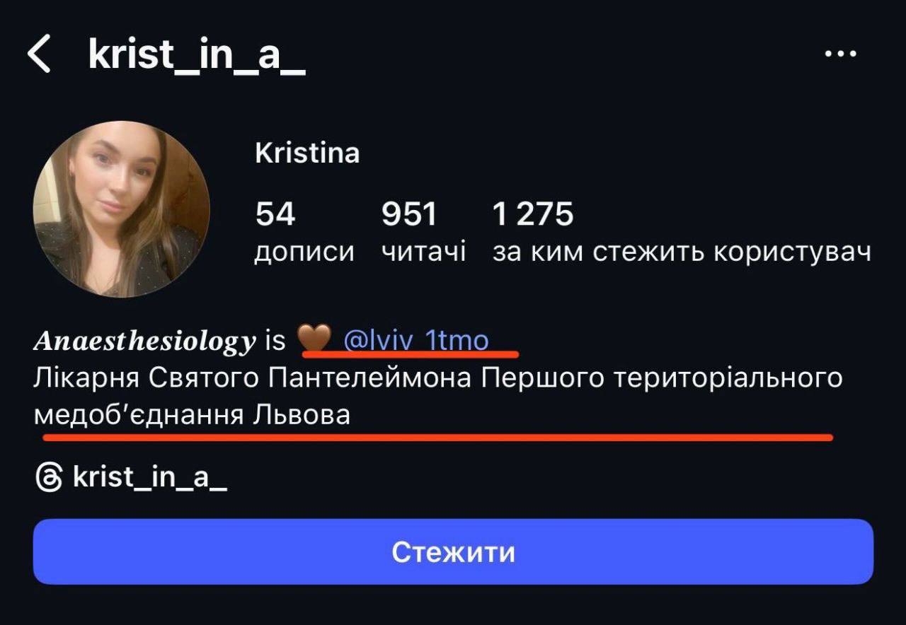 В обліковому записі зазначено, що жінка на ім’я Христина працює у лікарні Святого Пантелеймона Першого територіального медичного об’єднання Львова. А адміністратори пабліка дізналися, що вона обіймає посаду анестезіолога.