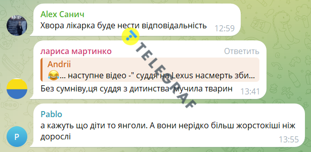 Хтось із користувачів повідомив, що жінка у коментарях радісно писала, що кошеня вже не виривається. Тварина звикла до знущань, а їм це весело. Також наголошується, що це відбувалося неодноразово.
