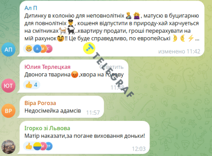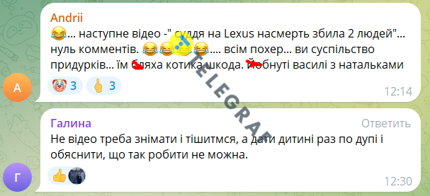 Водночас вона не запобігла знущанню, а знімала це на відео та викладала у ТікТок. Складається враження, що вона "виховувала" доньку лише на камеру. А за її тоном навіть не зрозуміло, що вона не схвалює дії дівчинки, швидше в ньому прозирає ледве стримуваний сміх.