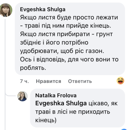 У коментарях одна жінка наголосила, що це робиться, аби надлишок трави не псував ґрунт. Адже це може сприяти утворенню плісняви та поширенню деяких хвороб. Однак тут виникло логічне питання: як же в лісі трава росте без обмежень та не шкодить ґрунту.