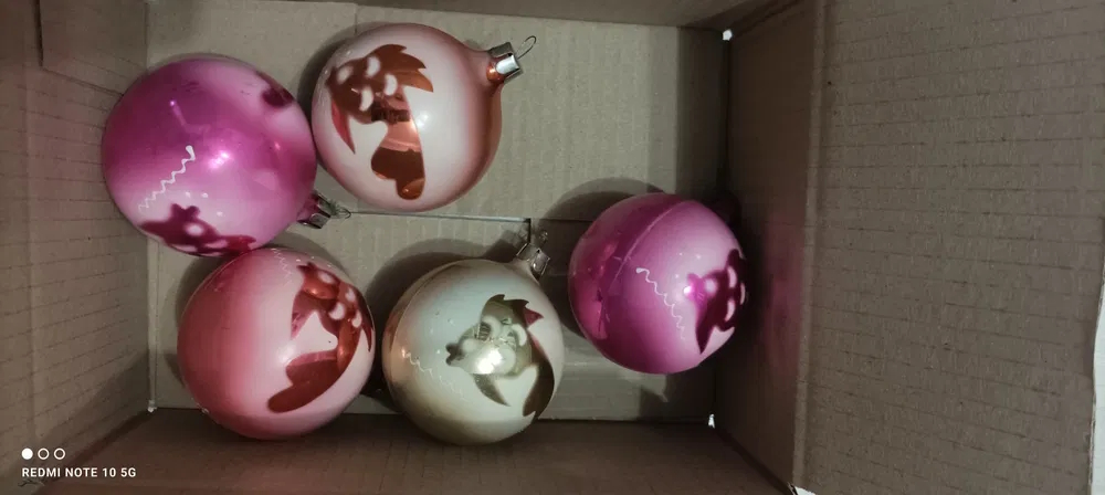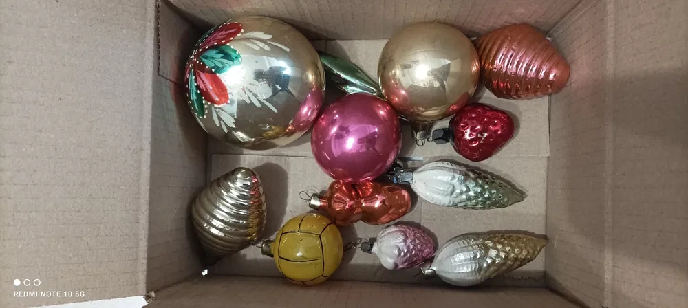 Наразі в асортименті є 4 набори іграшок. Власник показав, як виглядає цей "скарб". На фото помітно, що у чотирьох різних коробках зберігаються, здається, прикраси з різних комплектів та наборів. Зокрема, різноманітні кулі, шишки, дзвоники тощо.