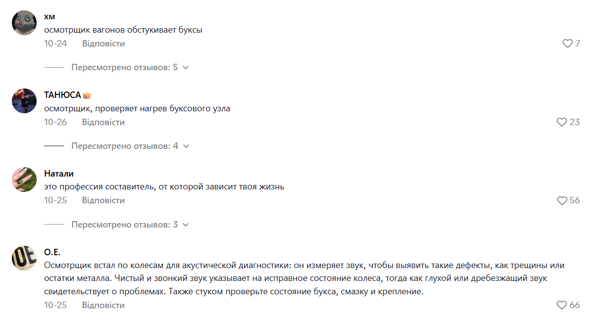 Користувач "brekstaf" опублікував у тік-ток відео, на якому показав працівника "Укрзалізниці", який ходить із ліхтариком і стукає по колесах поїзда. Автор ролика обурився, мовляв, що це за професія така і за що цій людині платять зарплату.