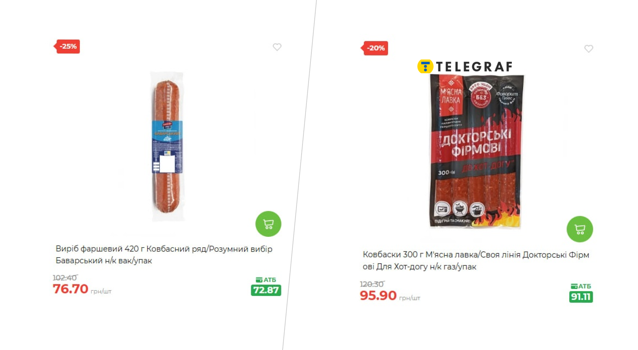 Серед товарів зі значними знижками — ковбаси, які раніше коштували майже вдвічі дорожче. Наприклад, "М’ясна лавка" молочна тепер коштує 102,90 гривень за 550 грамів замість 171,60 гривень, а "М’ясна лавка" прем’єра — 107,50 гривень за 420 грамів. Остання знизила цінник на 72,5 гривні. Шинкова ковбаса цієї серії подешевшала з 221,90 гривень до 121,90 гривень за 500 грамів.