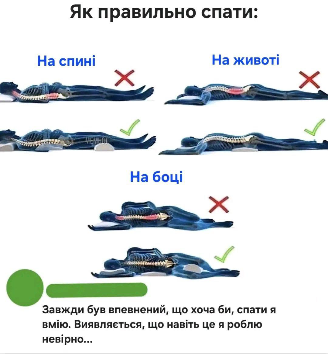 Telegram-канал опублікував зображення з правильним та неправильним положенням тіла під час сну. Виявляється, що спати треба, підклавши під себе невелику подушку. В різних позах подушка має бути в різних місцях.