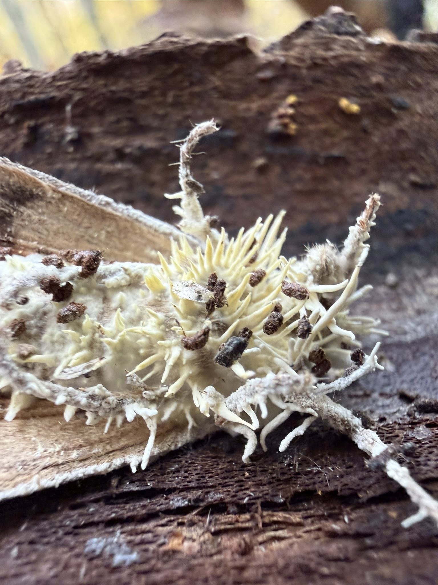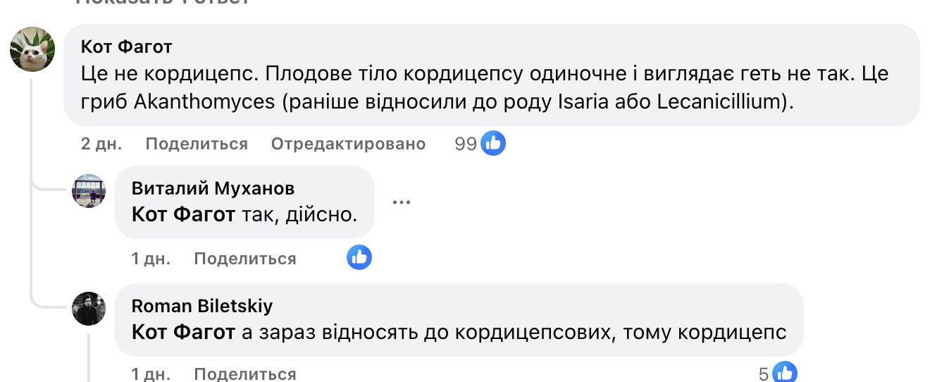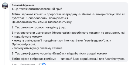 Один з користувачів розповів, як проходить зараження комахи грибом та його паразитування. На думку чоловіка, метелика вразив ентомопатогенний гриб. Після зараження він проростає всередині комахи, внаслідок чого вона гине. Далі тіло використовується як субстрат, де гриб спороносить та поширюється. Фактично це приклад паразитування грибів.