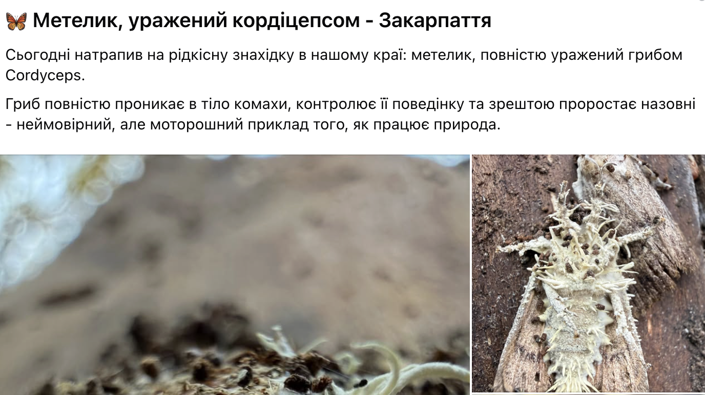 Повністю проник в тіло комахи: атакованого грибом метелика побачили на Закарпатті (рідкісне фото)