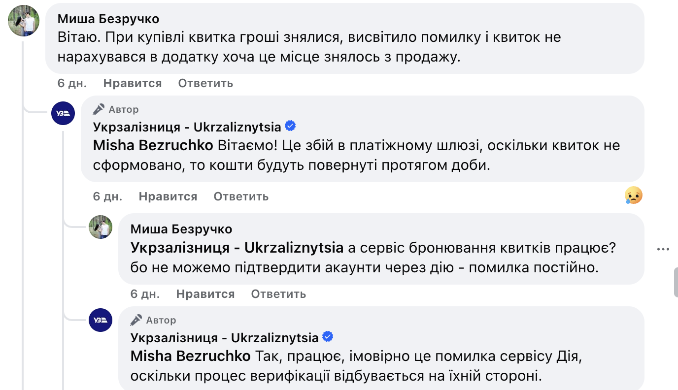Жінка написала, звертаючись до "Укрзалізниці", що під час купівлі квитка гроші з рахунку списались. Але потім в додатку висвітило помилку і квиток не нарахувався. При цьому в додатку це місце знялось з продажу. Трошки пізніше у користувачки виникли проблеми і з бронюванням місця, адже не виходило пройти верифікацію через "Дію".