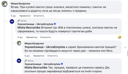 За словами транспортної компанії, виникли проблеми у роботі сервісів "Дії", як тільки вони запрацюють, верифікація теж працюватиме. А щодо грошей, які списались, в УЗ відповіли: "Вітаємо! Це збій в платіжному шлюзі, оскільки квиток не сформовано, то кошти будуть повернуті протягом доби". Тобто фактично гроші ніби застрягли між банком та рахунками перевізника. В такому разі кошти автоматично повертаються банком у зазначений ним період.