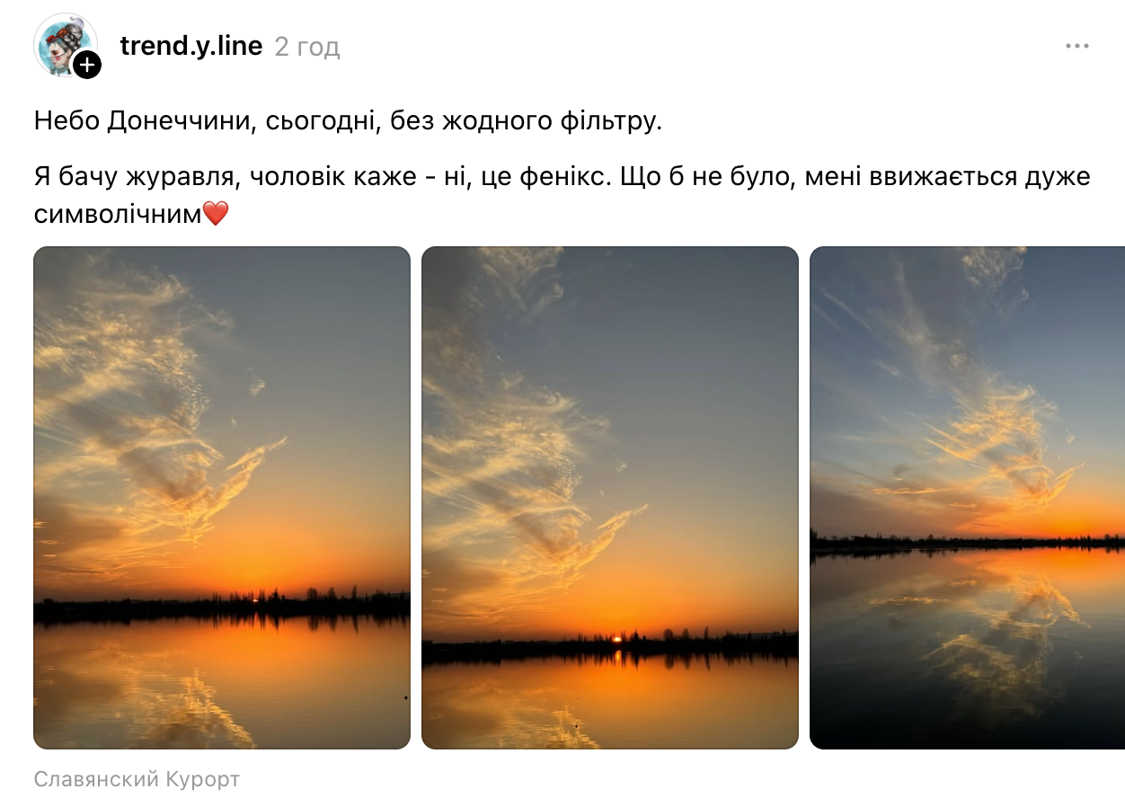 Відповідне фото опублікувала користувачка у Threads. За її словами, фото без жодного фільтра зроблені ввечері ймовірніше у Слов'янську, адже така геолокація виставлена на дописі.
