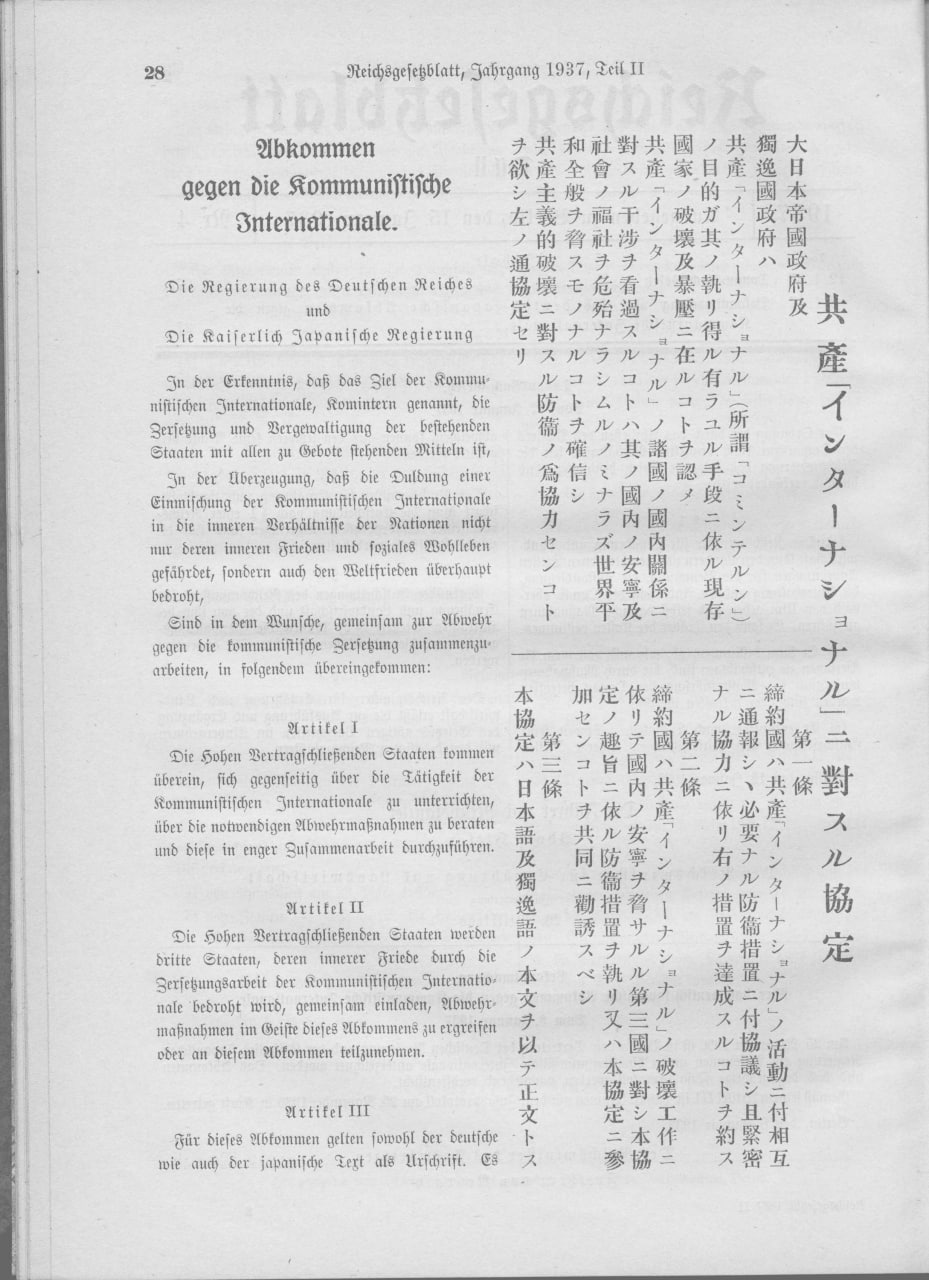 Уже 25 листопада нацистська Німеччина та імператорська Японія у Берліні підписали так званий Антикомінтернівський пакт, який координував політику цих держав стосовно Радянського Союзу. В Секретному протоколі були окреслені конкретні кроки в цьому питанні.