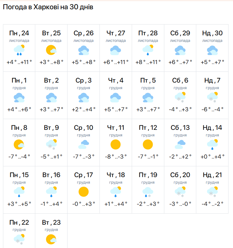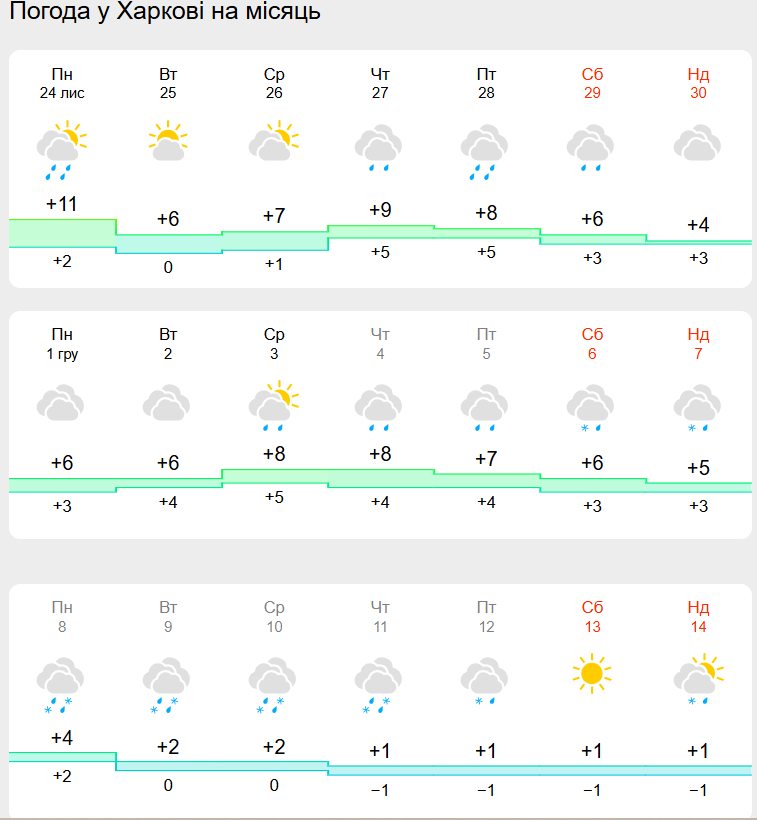 За даними метеорологічного сайту meteofor, з 6 по 12 грудня у Харкові очікується сніг з дощем. При цьому стовпчики термометрів опустяться нижче нуля лише з ночі 11 грудня. Надалі мокрий сніг також часто стоїть у прогнозі.