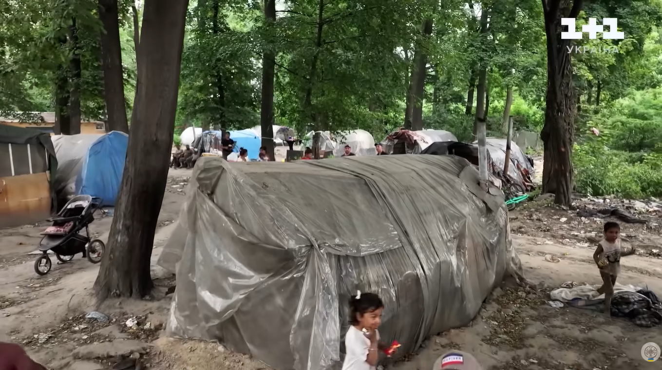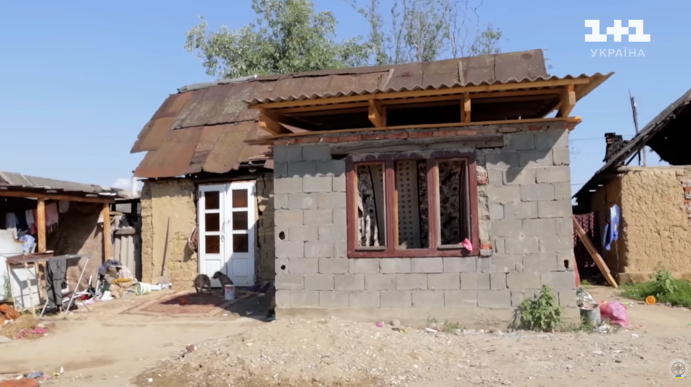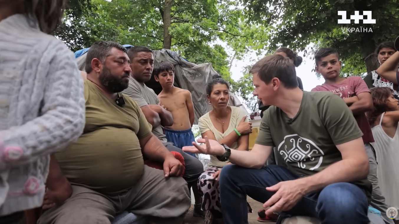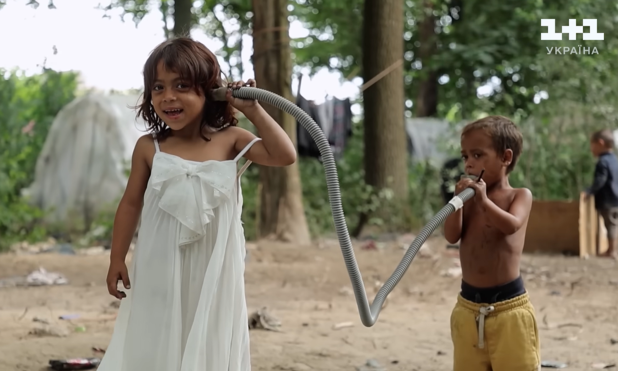 Поки ведучий спілкувався з місцевими, камера зафіксувала вкрай скромні умови життя ромів: біля кожного саморобного будиночка лежало сміття, з яким одночасно гралися брудні діти.