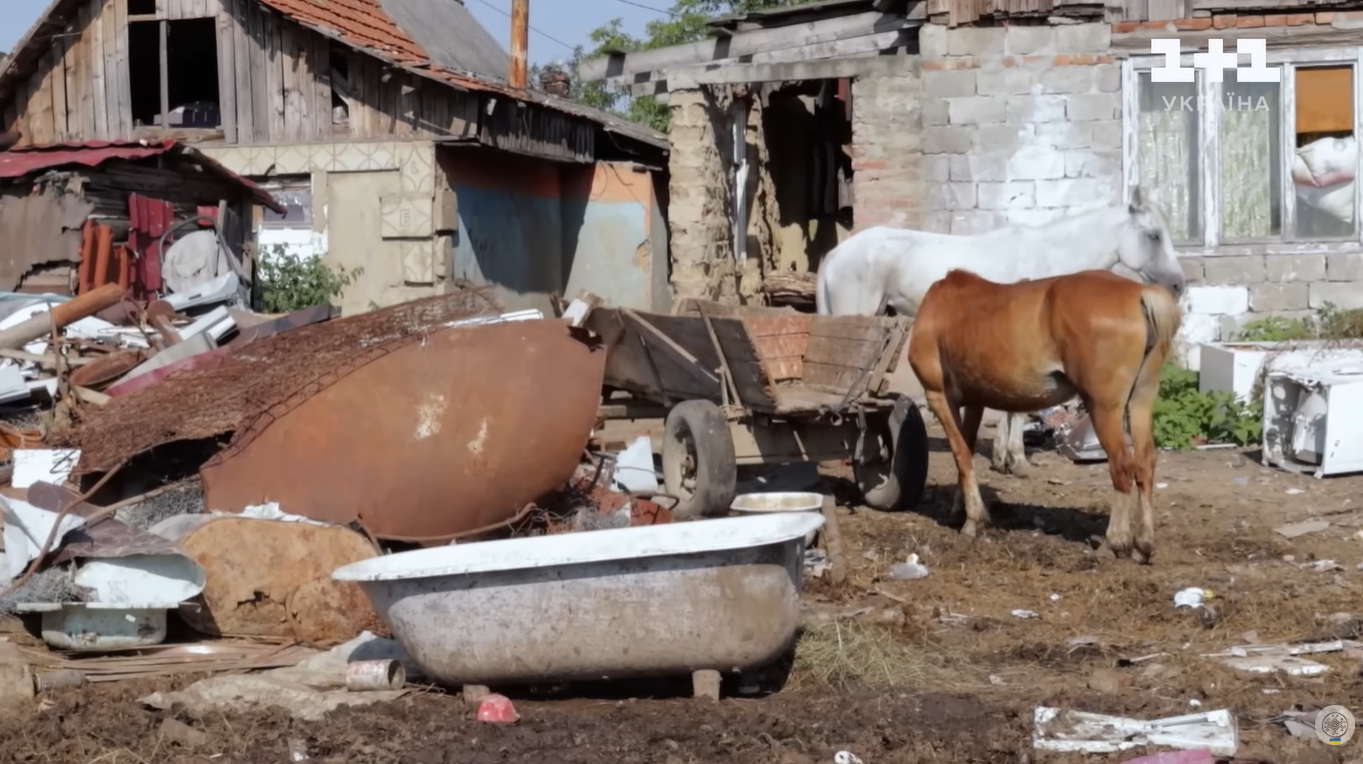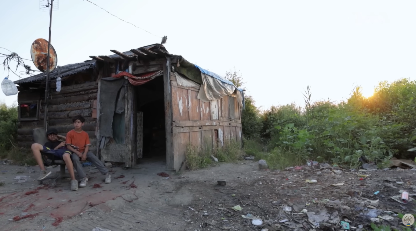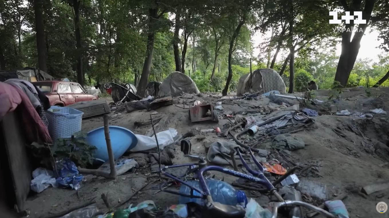 Поки ведучий спілкувався з місцевими, камера зафіксувала вкрай скромні умови життя ромів: біля кожного саморобного будиночка лежало сміття, з яким одночасно гралися брудні діти.