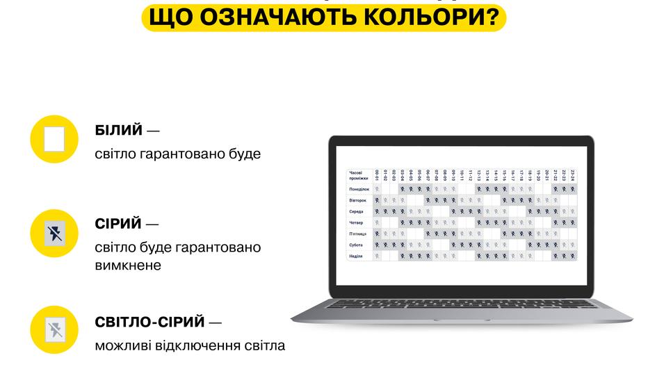 • сіра зона — світла немає орієнтовно 4 години (можливе відхилення близько 30 хвилин на перемикання)