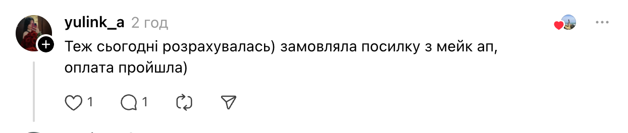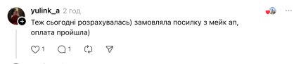 - "Теж сьогодні розрахувалась. Замовляла посилку з MAKEUP, оплата пройшла";