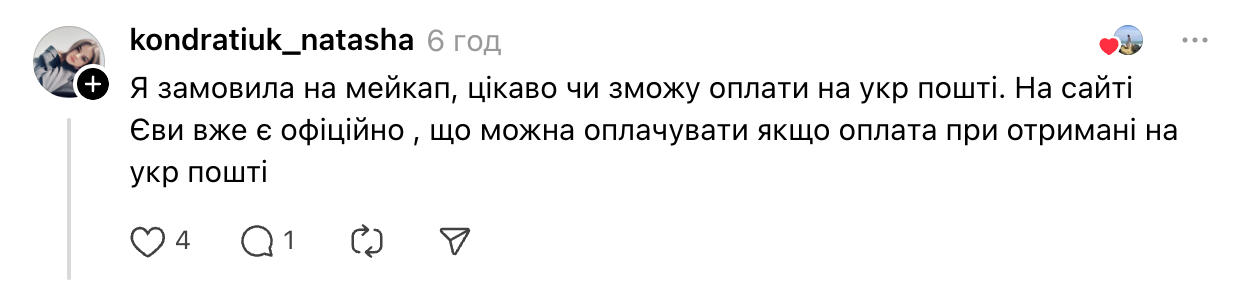 - "Я замовила на MAKEUP, цікаво, чи зможу оплати на Укрпошті. На сайті Єви вже є офіційно, що можна оплачувати, якщо оплата при отриманні на Укрпошті";