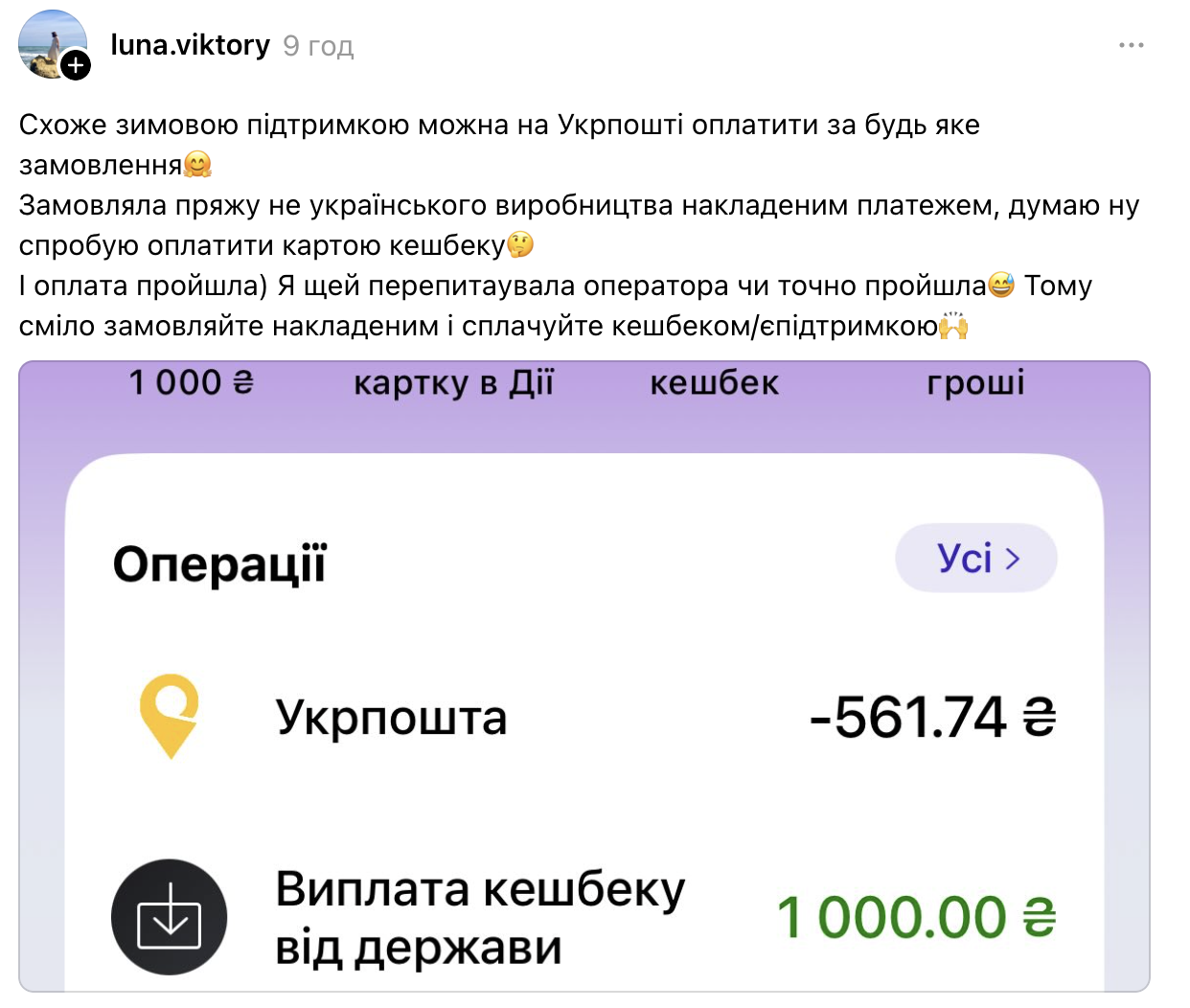 "Схоже зимовою підтримкою можна на Укрпошті оплатити за будь-яке замовлення. Замовляла пряжу не українського виробництва накладеним платежем, думаю, ну спробую оплатити картою кешбеку. І оплата пройшла", — пише користувачка.