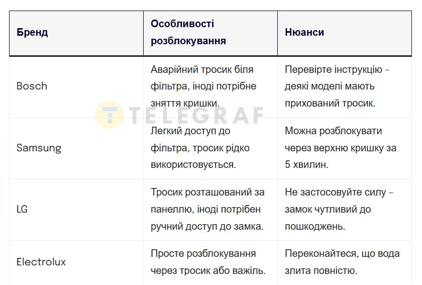 На сайті "Kokl.ua" ми знайшли зібрану базову інформацію про розблокування дверцят для різних брендів і моделей, включно з Bosch, Samsung та іншими популярними виробниками.