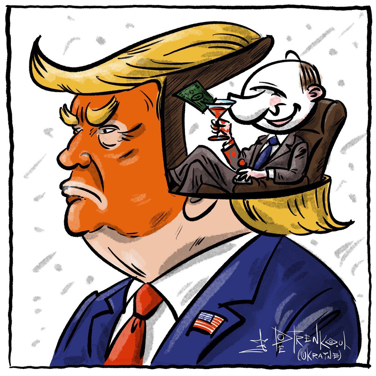 У багатьох виникло враження, що цей "план" писався у Москві, настільки сильно він відображав бажання Кремля. Петренко наочно показав на карикатурі вплив глави Кремля Володимира Путіна на Дональда Трампа. На картинці Путін сидить у голові Трампа з задоволеним виглядом та келихом алкоголю.
