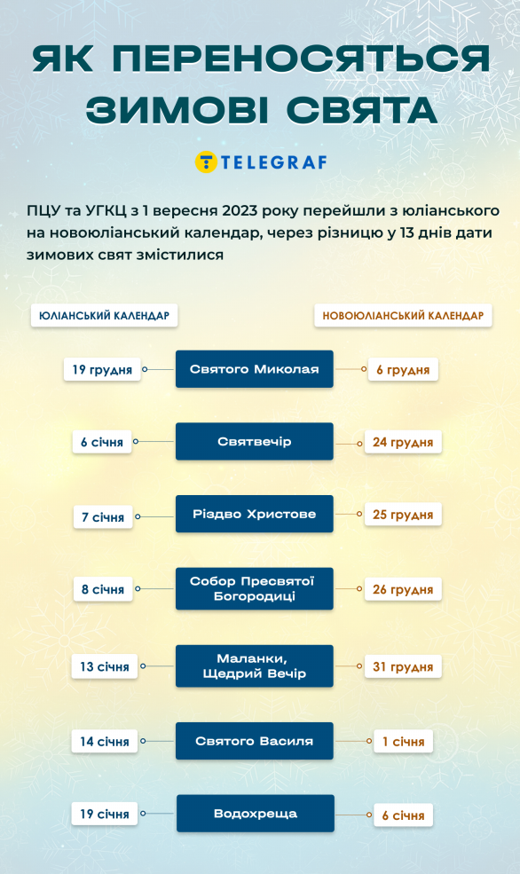 "Телеграф" підкреслює, що дати значних релігійних свят змінилися. Наразі вони відзначаються християнами східного обряду в Україні на 13 днів раніше.