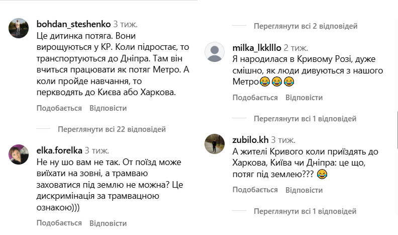 Натомість криворіжці коли приїздять до Харкова, Дніпра чи столиці дивуються, що під землею не трамваї, а потяги, вважають деякі коментатори.
