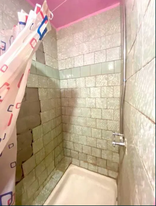 Але найжахливіше виглядають місця загального користування — душ з плиткою, що відвалилася та захаращений туалет. Кухню чомусь взагалі не згадали в об'яві, немає й фото. Зазвичай у гуртожитках є спільні кухні на кілька родин.