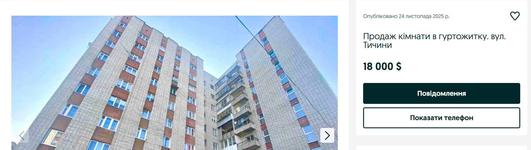 Пропозицію про продаж кімнати в гуртожитку по вулиці Тичини розміщено на одному з популярних сайтів. Кімнату розташовано на сьомому поверсі дев'ятиповерхівки.