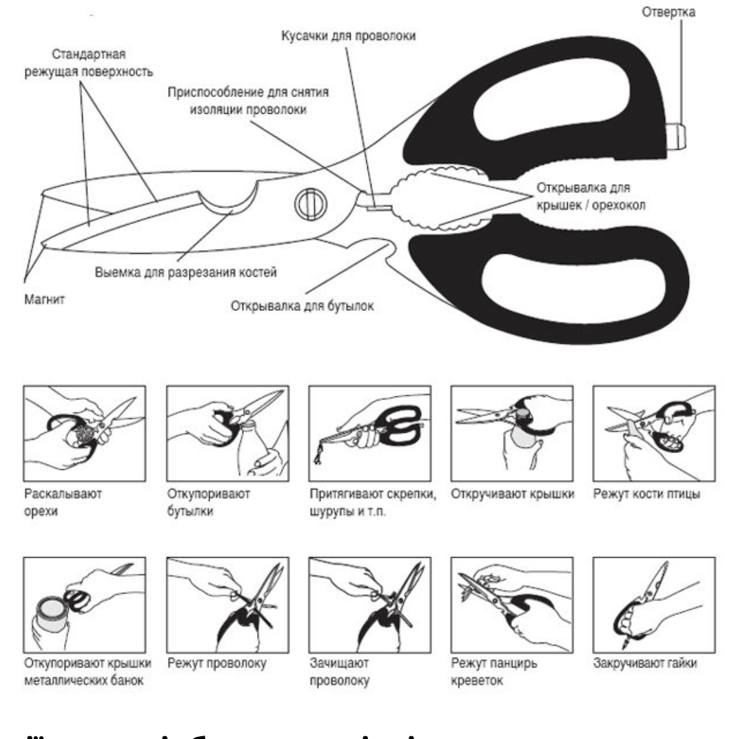 Деякі моделі кухонних ножиць можна використовувати як прихватки для гарячого, адже їх зубці допомагають добре утримувати ємність.