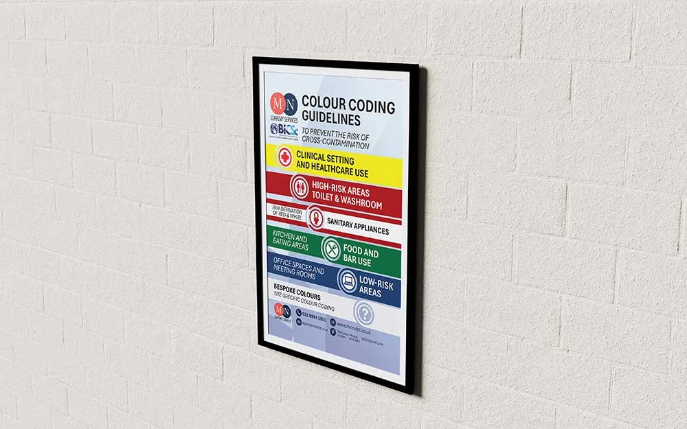 - Червоний — санітарні зони високого ризику, такі як туалети, пісуари та підлоги в туалетах