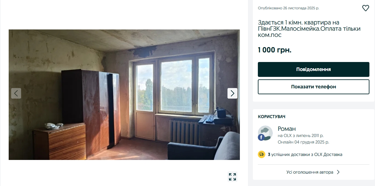 "Квартира без ремонту. Стоять вхідні залізні двері. З меблів тільки розкладний диван не в дуже хорошому стані, розкладний стіл-книжка, шафа, на кухні стіл, пара стільців, газова плита та тумба для посуду", — пише автор оголошення.
